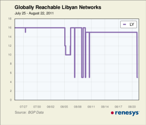 Naturalmente, visto che il web è uno strumento molto potente anche per far cadere le dittature, il regime sta mettendo i bastoni tra le ruote ai cyber-ribelli provocando dei black-out di internet in tutta la Libia. La Libyan Telecom e Technology, controllata dal regime, ha bloccato 16 blocchi di indirizzi IP sulle tabelle di routing che impediscono ai libici di uscire verso il mondo esterno.