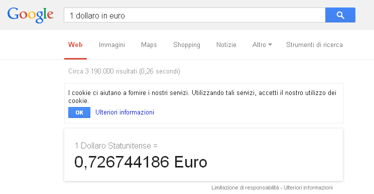 Dobbiamo andare negli Stati Uniti ma non ricordiamo quanti Euro vale 1 Dollaro? Allora andiamo su Google e nel box che di solito usiamo per le ricerche scriviamo: 1 dollaro in euro.