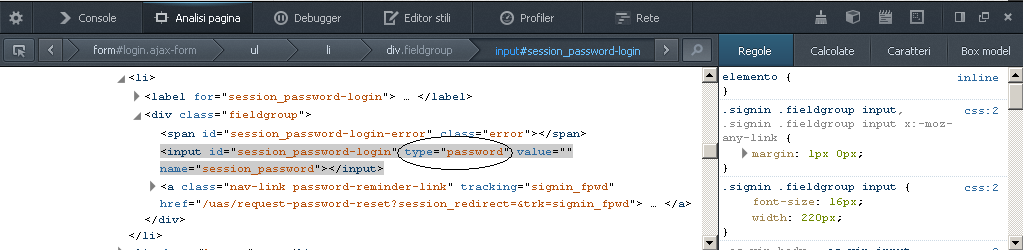 A questo punto cliccate due volte nel campo type=”password” e cancellate la parola password. Ora cliccate in un punto qualsiasi del browser ed ecco il risultato che otterrete.