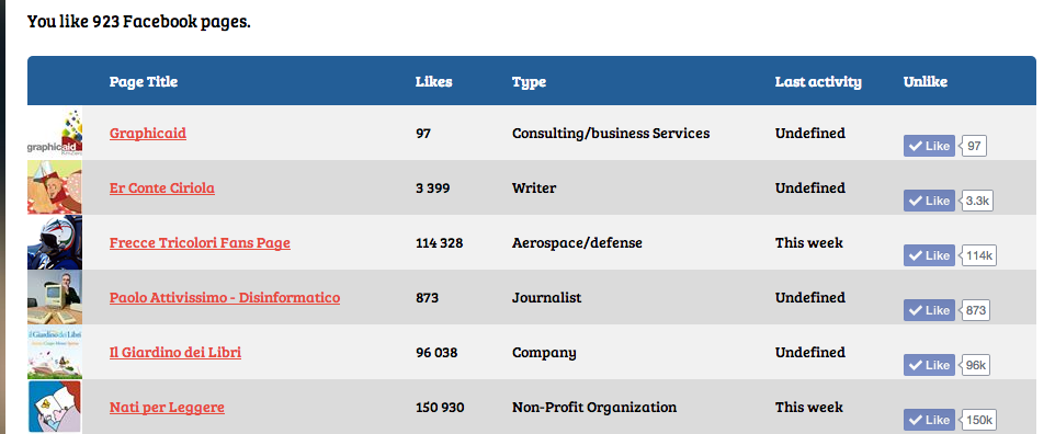 Una volta che avete autorizzato la piattaforma ad accedere al proprio account questo analizzerà i Mi Piace che avete messo alle FanPage e alla fine vi fornirà il seguente risultato.