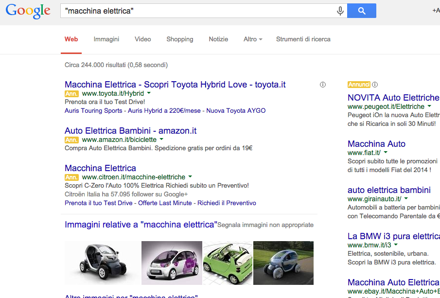 Se andiamo a scrivere la seguente stringa nel motore di ricerca, macchina+elettrica, andiamo a dire che deve essere effettuata una ricerca delle parole nell’ordine che ho scritto. L’utilizzo del simbolo + a differenza del virgolettato mi tira fuori i risultati dove le due parole appaiono esattamente in questa sequenza, mentre con le virgolette l’ordine potrebbe non essere rispettato o apparire risultati con solamente una delle due parole.