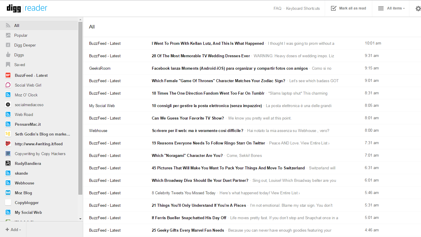 Una volta creato il vostro account (gratuito) andate sulla home page di Digg, qui trovate tutte le ultime notizie dei siti più popolari sul web, se volete invece vedere i tuoi siti salvati andate sul menù in alto e poi cliccate su Reader. Qui trovate una schermata con una colonna a sinistra dove troverete tutti i vostri siti preferiti salvati, mentre sulla destra trovate gli articoli del sito di riferimento.